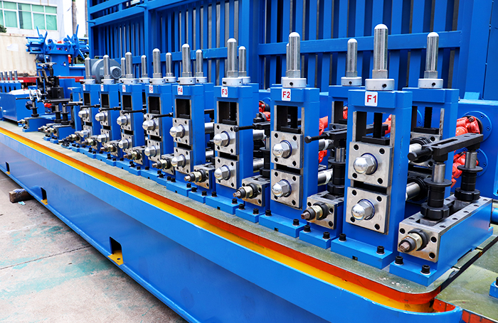 | Configuração da Máquina | 1. lado duplo desbobinador cortador de tiras 2.steel 3. acumulador de material tipo vertical máquina 4.forming e dimensionamento serra de corte 5.pipe (corte frio ou corte de atrito) plataforma de descarga 6.pipe 7.moldes de rolamento 8.high frequency aparelhos | ||||
